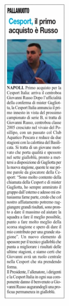 Dopo l’ufficialità della conferma di mister Gagliotta, la Cesport Italia annuncia il primo innesto in vista del prossimo campionato di serie B, si tratta di Giovanni Russo, centroboa classe 2005 cresciuto nel vivaio del Posillipo, con un passato col Club Aquatico Pescara e reduce da due stagioni con la calottina del Basilicata.